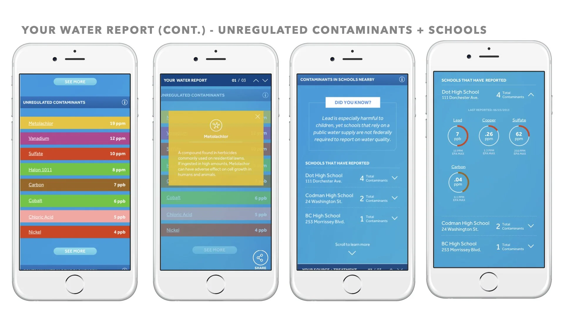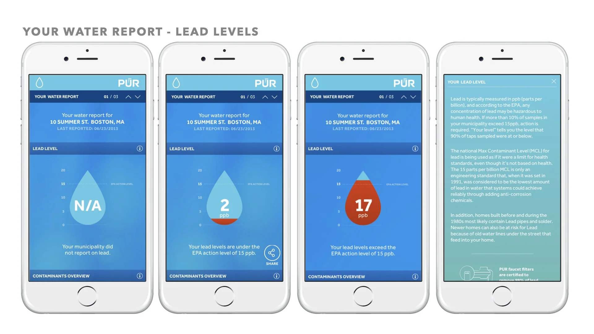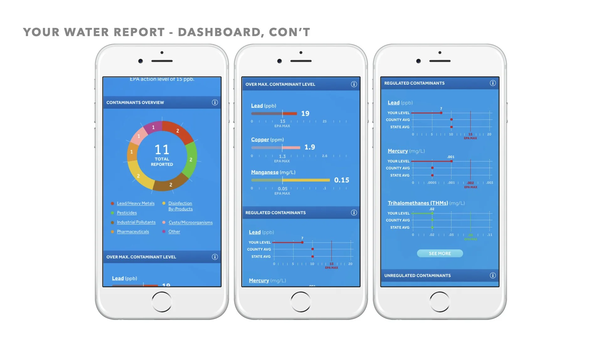 We wanted to start with whats most important to the user. According to the most recent water quality data, this is what’s in your water. leveraging data viz layouts, users can get a report that is shareable.
