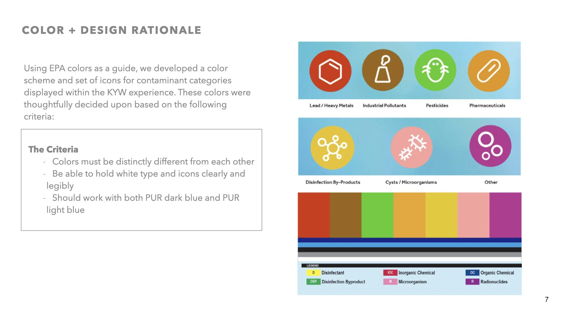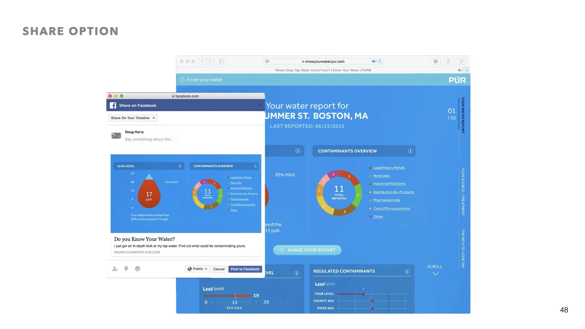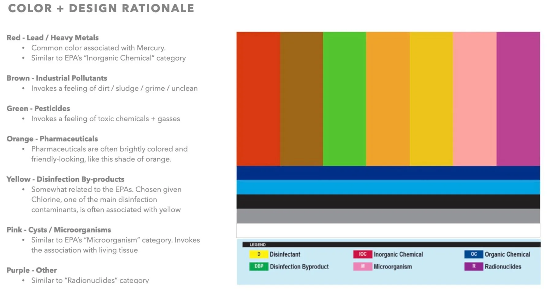 We wanted to start with whats most important to the user. According to the most recent water quality data, this is what’s in your water. leveraging data viz layouts, users can get a report that is shareable.