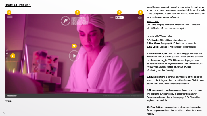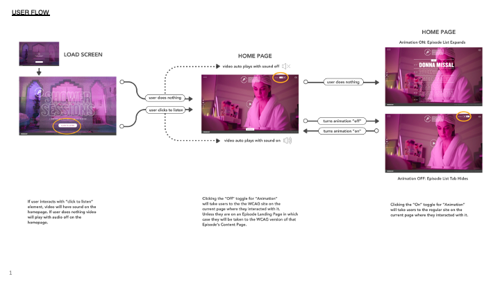 In addition to designing a fully interactive & immersive site, we also had to create a WCAG-friendly experience. Given that this was still owned by Progressive we did have to meet their accessibility guidelines. We didn’t want to compromise the site but we knew we had to be inclusive. We decided to create a parallel experience for those with visual or other impairments. We created separate user flows, guidelines, and functional specs for the WCAG version. We had to eliminate some of the functionality and micro-interactions in order to meet compliance standards. If a user turned the animation toggle off, they would no longer be in the interactive version of the site but the simplified one. In this experience we hid the sticky episode list tab that was at the bottom of the page.